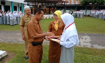 SelengkapnyaKepala SMK Negeri 1 Batang Angkola, Drs. H. Afifuddin Lubis, M.AP menyerahkan penghargaan khusus kepada Masraini Afrilia, siswa kelas X TKJ 1, selesai pelaksanaan Upacara bendera senin, 30 Juli 2018, yang sudah berprestasi mempersembahkan medali perak dan mengharumkan nama sekolah.